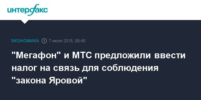 Москва. 7 июля. INTERFAX.RU - Глава ПАО "Мегафон" Сергей Солдатенков и президент ПАО "Мобильные Телесистемы" Андрей Дубовсков на встрече с автором законопроекта о хранении личных данных пользователей депутатом Ириной Яровой предложили ввести дополнительный налог для операторов связи.