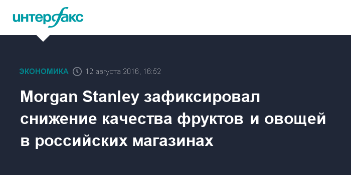Москва. 12 августа. INTERFAX.RU - Качество свежих фруктов и овощей в РФ значительно ухудшилось со времени введения запрета на импорт продуктов питания из ЕС и Турции, говорится в обзоре Morgan Stanley. К такому выводу пришли аналитики инвестбанка, проведя анализ продукции в различных форматах российских магазинов регионального и федерального уровня.