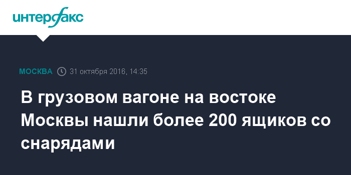 Москва. 31 октября. INTERFAX.RU - Более 200 ящиков с артиллерийскими боеприпасами обнаружили сотрудники спецслужб в грузовом вагоне, находившемся неизвестно сколько времени в одном из железнодорожных тупиков на востоке Москвы, сообщил "Интерфаксу" источник в правоохранительных органах.