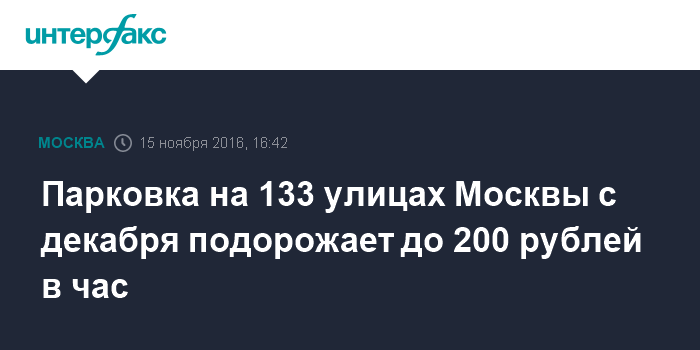 Москва. 15 ноября. INTERFAX.RU - Из-за загруженности движения тарифы на парковку на некоторых улицах Москвы со 2 декабря будут повышены до 200 рублей в час, сообщили "Интерфаксу" в пресс-службе столичного департамента транспорта и развития дорожно-транспортной инфраструктуры во вторник.