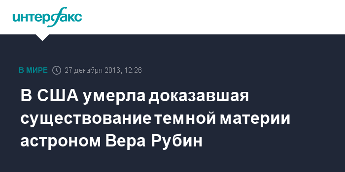 Москва. 27 декабря. INTERFAX.RU - Американский астроном Вера Рубин, чьи исследования помогли доказать существование темной материи, скончалась в воскресенье в возрасте 88 лет, сообщает во вторник американский телеканал Fox News со ссылкой на ее сына. Рубин жила в городе Принстон (штат Нью-Джерси).