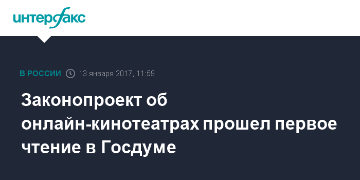 Москва. 13 января. INTERFAX.RU - Госдума в пятницу приняла в первом чтении законопроект об онлайн-кинотеатрах.