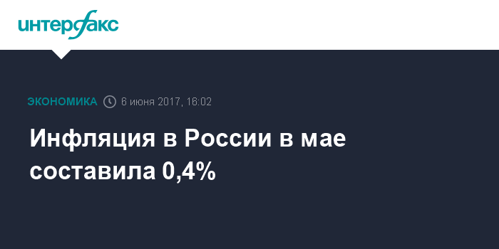 В годовом выражении инфляция в мае 2017 года, по данным Росстата, осталась на уровне апреля (4,1%), которого она достигла после 4,3% в марте, 4,6% в феврале, 5,0% в январе и 5,4% в декабре. Инфляция оказалась выше ожиданий аналитиков и Минэкономразвития. Консенсус-прогноз экономистов по инфляции на май, подготовленный "Интерфаксом", равнялся 0,3%. Минэкономразвития ожидало годовую инфляцию по итогам мая на уровне 3,9-4%.