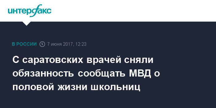 Москва. 7 июня. INTERFAX.RU - Министр здравоохранения Саратовской области отменил приказ, обязывающий главных врачей медицинских учреждений предоставлять в органы внутренних дел информацию, касающуюся половой жизни несовершеннолетних, сообщает пресс-служба министерства.