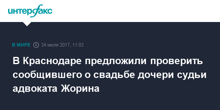 Москва. 24 июля. INTERFAX.RU - Председатель Совета судей Краснодарского края Владимир Кисляк призвал дать правовую оценку действиям адвоката Сергея Жорина, распространившего сведения о "золотой" свадьбе дочери краснодарской судьи Елены Хахалевой.
