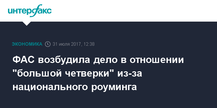Москва. 31 июля. INTERFAX.RU - Федеральная антимонопольная служба возбудила дело в отношении ПАО "Вымпелком" , ПАО "Мегафон" , ПАО "МТС" и Tele2 по вопросу национального роуминга.
