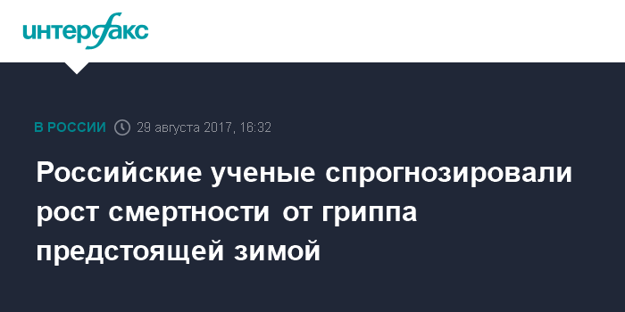 Москва. 29 августа. INTERFAX.RU - В эпидемическом сезоне 2017-2018 годов вероятен рост смертности от гриппа и осложнений после него, заявила заместитель директора НИИ гриппа по научной работе Людмила Цыбалова.