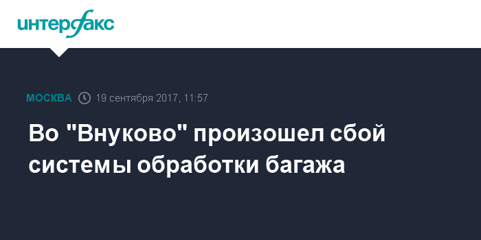 Москва. 19 сентября. INTERFAX.RU - В московском аэропорту "Внуково" во вторник утром произошел сбой системы обработки багажа фирмы Vanderlande, сообщил "Интерфаксу" официальный представитель аэропорта.
