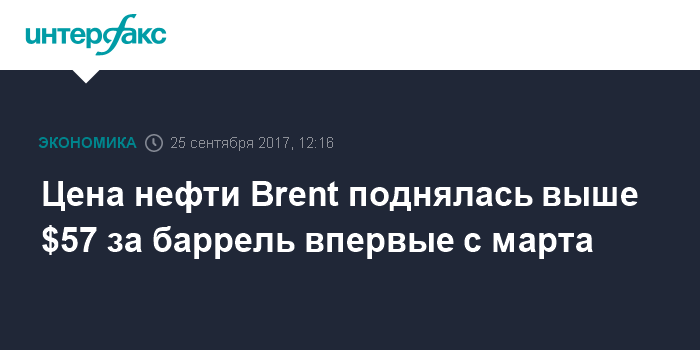 Москва. 25 сентября. INTERFAX.RU - Стоимость нефти Brent на торгах в Лондоне в понедельник поднялась выше $57 за баррель - внутридневное повышение цены до этого уровня отмечено впервые с марта 2017 года.