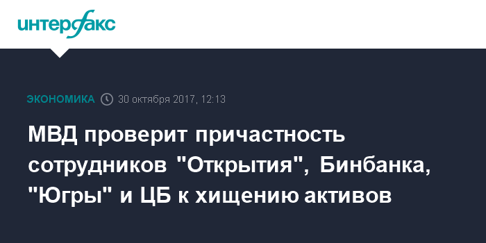Министерство сообщило, что запросило у Банка России сведения о возможной противоправной деятельности руководителей и сотрудников санируемых Бинбанка и банка "Открытие". Кроме того, МВД запросило данные о возможной противоправной деятельности должностных лиц Банка России, связанной с хищением активов "Открытия", Бинбанка и "Югры".