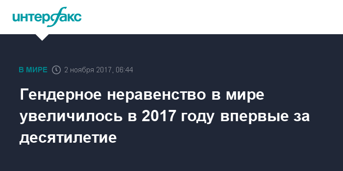 Москва. 2 ноября. INTERFAX.RU - Ситуация с гендерным неравенством в мире ухудшилась в 2017 году впервые за всю историю подсчета этого показателя, показывает Global Gender Gap Index (индекс гендерного разрыва), который с 2006 года публикует Всемирный экономический форум (ВЭФ). Разрыв между мужчинами и женщинами в 2017 году удалось нивелировать на 68% против 68,3% в 2016 году.