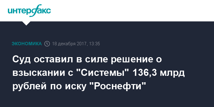 Москва. 18 декабря. INTERFAX.RU - Апелляционный суд оставил без изменения решение первой инстанции по иску "Роснефти" и "Башнефти" к АФК "Система" на 170,6 млрд руб.