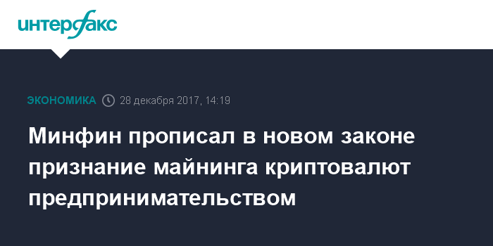 Москва. 28 декабря. INTERFAX.RU - Майнинг криптовалют в законопроекте о регулировании цифровых активов определен как предпринимательская деятельность, сообщил замминистра финансов Алексей Моисеев журналистам.