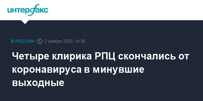 Москва. 2 ноября. INTERFAX.RU - Сразу четыре клирика Русской православной церкви умерли в минувшие выходные дни от осложнений, вызванных коронавирусом, сообщила в понедельник рабочая группа при патриархе Кирилле.