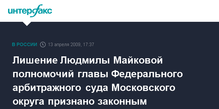 Москва. 13 апреля. INTERFAX.RU - Верховный суд РФ признал законным решение о досрочном лишении Людмилы Майковой полномочий главы Федерального арбитражного суда Московского округа (ФАС МО).