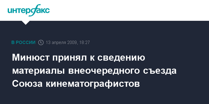 Москва. 13 апреля. INTERFAX.RU - Министерство юстиции России уведомило руководство Союза кинематографистов России (СКР) о том, что материалы внеочередного чрезвычайного съезда СКР приняты к сведению.