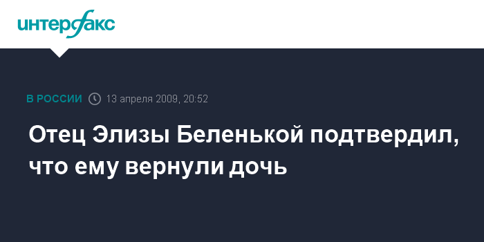 Париж. 13 апреля. INTERFAX.RU - Жан-Мишель Андрэ, отец Элизы Беленькой, девочки из франко-русской семьи, которая была похищена во Франции 20 марта, в понедельник вечером подтвердил своему адвокату, что ему вернули дочь в Венгрии, где она была обнаружена вместе с матерью Ириной Беленькой при попытке пересечь венгерско-украинскую границу, сообщают французские СМИ.