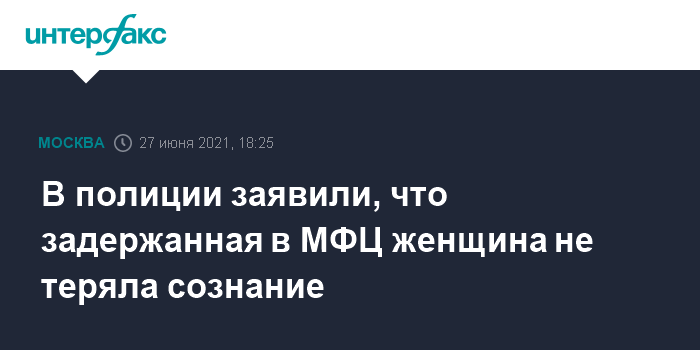 Москва. 27 июня. INTERFAX.RU - В московской полиции опровергли появившуюся в СМИ информацию о том, что женщина потеряла сознание во время задержания в отделении МФЦ на севере Москвы в субботу.