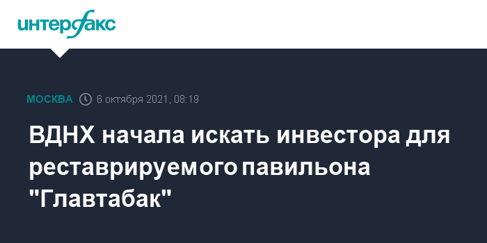 Москва. 6 октября. INTERFAX.RU - ВДНХ ищет инвестора на право долгосрочной аренды павильона №35 "Главтабак", сообщил "Интерфаксу" руководитель пресс-службы выставки Александр Жестков. Сейчас павильон находится на реставрации, которую должны завершить в 2022 году.