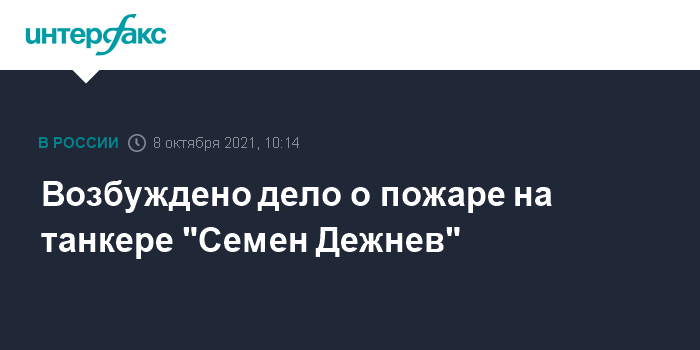 Москва. 8 октября. INTERFAX.RU - В связи с пожаром на танкере "Семен Дежнев" на реке Лена возбуждено уголовное дело о нарушении требований охраны труда, повлекшее по неосторожности причинение тяжкого вреда здоровью человека (ч. 1 ст. 143 УК), сообщило Восточное межрегиональное следственное управление на транспорте СКР.