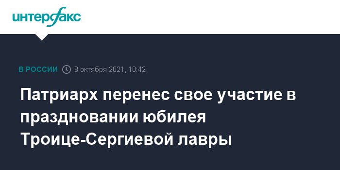 Москва. 8 октября. INTERFAX.RU - Из-за пандемии патриарх Московский и всея Руси Кирилл отказался от личного участия в праздновании 75-летия Троице-Сергиевой лавры и в мероприятиях памяти преподобного Сергия Радонежского.