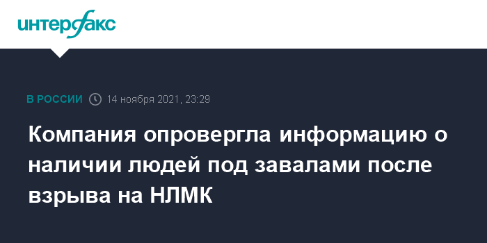 Москва. 14 ноября. INTERFAX.RU - Пресс-служба Новолипецкого металлургического комбината опровергла сообщение МЧС, что под завалами могут находиться пострадавшие люди. В компании подчеркнули, что эта информация не соответствует действительности.