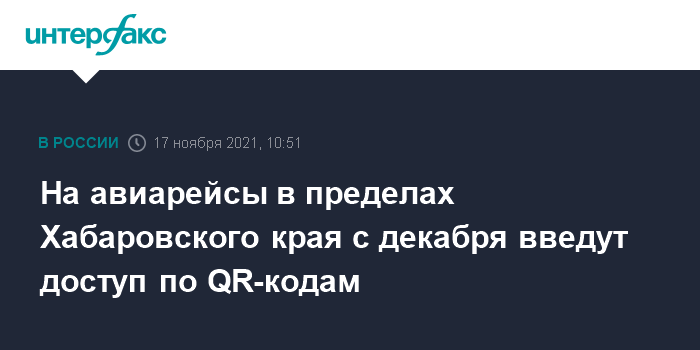 Москва. 17 ноября. INTERFAX.RU - В Хабаровском крае с 1 декабря летать в пределах региона можно будет только пассажирам с QR-кодами о вакцинации или перенесенном COVID-19, сообщила пресс-служба правительства региона.
