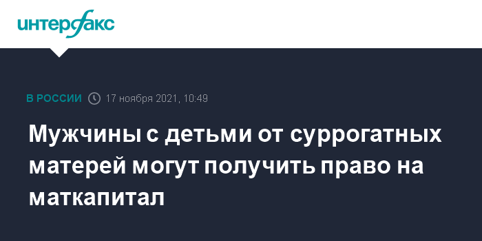 "Подготовленный проект предусматривает, что в том случае, если мужчина в установленном порядке признан единственным родителем ребенка, рожденного от суррогатной матери, он получит право на материнский капитал. Распространяется право на материнский капитал и на ситуации, когда мужчина растит детей от суррогатной матери вместе с супругой, усыновившей их", - сказал Груздев журналистам в среду.