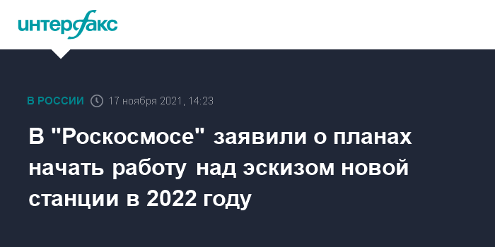Москва. 17 ноября. INTERFAX.RU - Разработка эскизного проекта новой российской орбитальной станции начнется, как ожидается, в 2022 году, она займет около полутора лет, сообщил "Интерфаксу" исполнительный директор "Роскосмоса" по перспективным программам и науке Александр Блошенко.