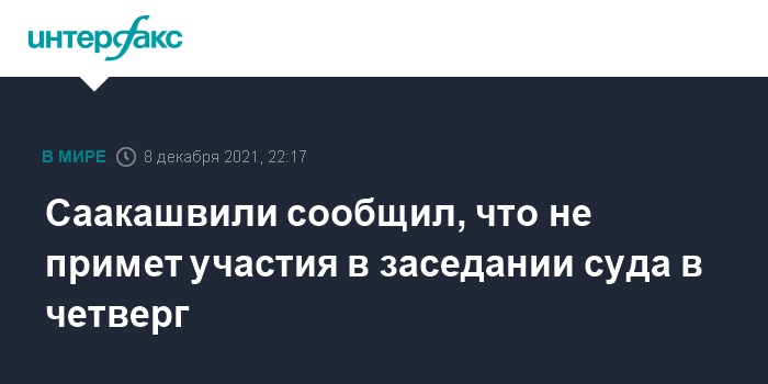 Москва. 8 декабря. INTERFAX.RU - Бывший президент Грузии Михаил Саакашвили сообщил в среду на своей странице в Facebook, что не примет участия в судебном процессе против него в четверг.