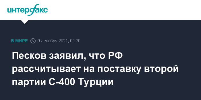 Москва. 9 декабря. INTERFAX.RU - Российская сторона надеется, что поставка еще одной партии систем ПВО С-400 Турции состоится, заявил в интервью греческому телеканалу ANT1 пресс-секретарь президента РФ Дмитрий Песков.