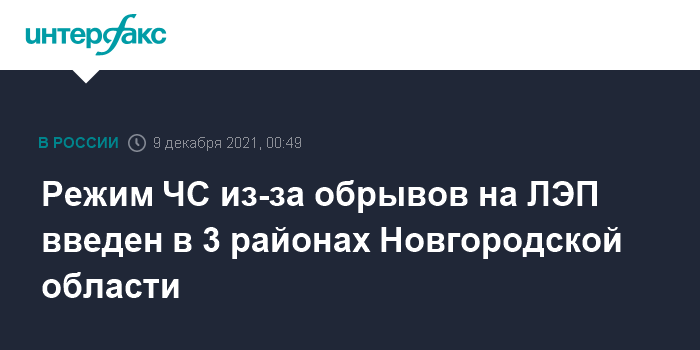 Москва. 9 декабря. INTERFAX.RU - Новгородские власти из-за обрывов на линиях электропередачи ввели режим ЧС в 3 районах области, сообщила пресс-служба регионального ГУ МЧС.