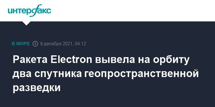 Москва. 9 декабря. INTERFAX.RU - Ракета Electron, стартовавшая в четверг из Новой Зеландии, успешно вывела на орбиту два спутника дистанционного зондирования Земли (ДЗЗ) американской компании геопространственной разведки BlackSky, сообщила разработчик носителя Rocket Lab.