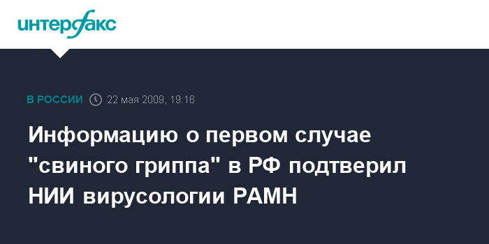 Москва. 22 мая. INTERFAX.RU - Первый случай так называемого "свиного" гриппа был выявлен НИИ вирусологии имени Ивановского Российской академии медицинских наук (РАМН) и официально подтвержден вечером в пятницу, сообщил "Интерфаксу" директор института профессор Дмитрий Львов.