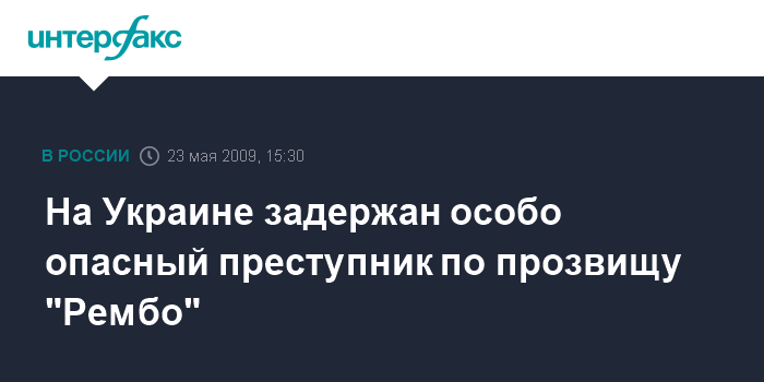 Москва. 23 мая. INTERFAX.RU - Сотрудники УБОП ГУ МВД Украины во Львовской области задержали в Рогатине (Ивано-Франковская область) особо опасного преступника, который находится в межгосударственном розыске, известного в криминальных кругах как "Рембо".