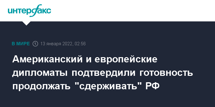 Москва. 13 января. INTERFAX.RU - Первый замгоссекретаря США Уэнди Шерман и представители Франции, Германии, Италии и Великобритании на состоявшейся встрече подтвердили, что готовы совместно продолжать усилия по "сдерживанию России" в украинском вопросе, говорится в сообщении американского госдепа по итогам встречи.