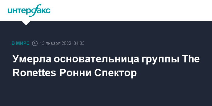 Москва. 13 января. INTERFAX.RU - Основательница группы The Ronettes Вероника Беннетт, выступавшая под псевдонимом Ронни Спектор, умерла на 79-м году жизни. Об этом сообщила ее семья в заявлении, опубликованном на сайте исполнительницы в среду.