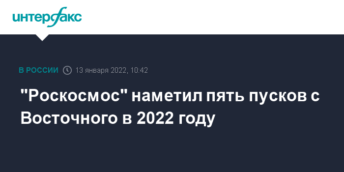Москва. 13 января. INTERFAX.RU - В 2022 году запланировано пять пусков космических ракет, которые проведут с космодрома Восточный, сообщил гендиректор "Роскосмоса" Дмитрий Рогозин на совещании об итогах работы госкорпорации за 2021 год.