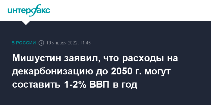 "Ежегодно расходы на комплексные меры по снижению углеродного следа, по предварительной оценке, могут составить от 1 до 2% ВВП в горизонте до 2050 года. Мы планируем двигаться по нескольким направлениям - от полного восстановления лесных массивов после их вырубки до развития альтернативных источников энергии и формирования на их основе новой инфраструктуры промышленности и транспорта", - сказал Мишустин.