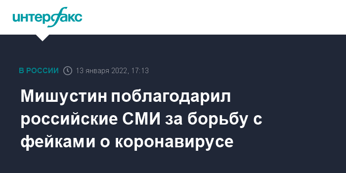 Москва. 13 января. INTERFAX.RU - Премьер-министр РФ Михаил Мишустин поблагодарил российские СМИ за то, что в 2021 году они боролись с фейками на тему коронавируса и помогали людям получить достоверную информацию о болезни.