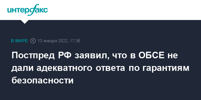 Москва. 13 января. INTERFAX.RU - Россия не получила от партнеров по ОБСЕ адекватного ответа и реакции на свои предложения по гарантиям безопасности, заявил в четверг постпред РФ при ОБСЕ Александр Лукашевич.