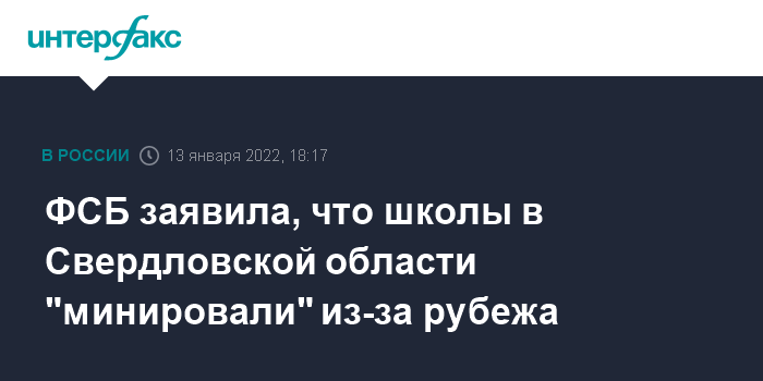 Москва. 13 января. INTERFAX.RU - Сообщения о минировании образовательных учреждений в Свердловской области, из-за которых в среду, 12 января, были эвакуированы десятки тысяч человек, поступили из-за рубежа, заявили в пресс-службе регионального управления ФСБ.