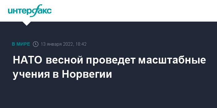 Москва. 13 января. INTERFAX.RU - Норвегия уведомила Россию о проведении масштабных военных учений НАТО в Норвежском море и на территории Норвегии, сообщили в пресс-службе Северного флота.