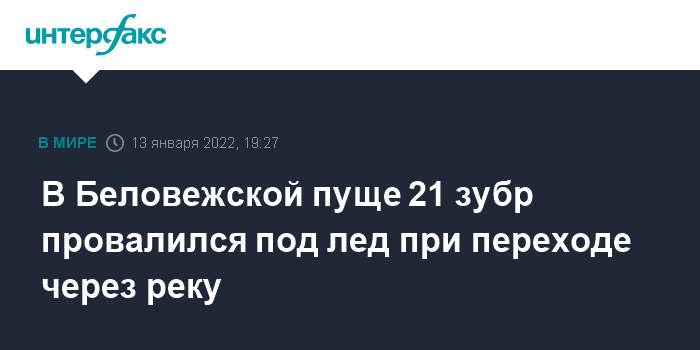 Москва. 13 января. INTERFAX.RU - Массовая гибель зубров произошла на территории "Беловежской пущи" в Гродненской области Белоруссии после того, как часть стада провалилась под лед, сообщили в Минприроды Белоруссии.