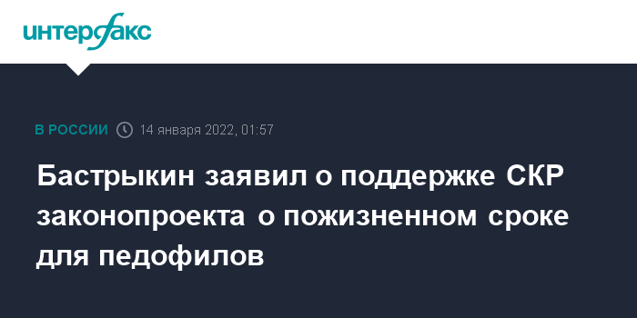 Москва. 14 января. INTERFAX.RU - Следственный комитет РФ (СКР) поддерживает законопроект, согласно которому педофилам-рецидивистам будет грозить пожизненное лишение свободы, заявил глава ведомства Александр Бастрыкин в интервью "Российской газете".