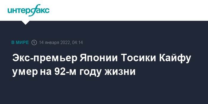 Москва. 14 января. INTERFAX.RU - Бывший премьер-министр Японии Тосики Кайфу скончался в возрасте 91 года, сообщают Kyodo и NHK.