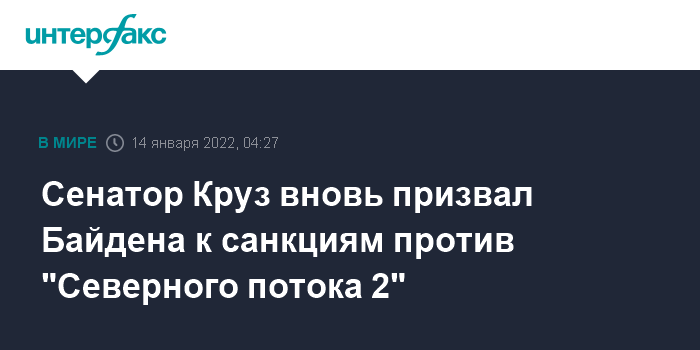 Москва. 14 января. INTERFAX.RU - Сенатор Тед Круз обратился к президенту США Джо Байдену с призывом о введении санкций против газопровода "Северный поток 2" после того, как Сенат заблокировал его законопроект по этому вопросу.