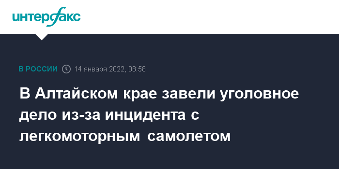 Москва. 14 января. INTERFAX.RU - По факту авиационного происшествия с легкомоторным самолетом "Аэропракт-22" в Алтайском крае возбуждено уголовное дело по признакам нарушения правил безопасности движения и эксплуатации воздушного транспорта, сообщает Восточное межрегиональное СУ на транспорте СКР.