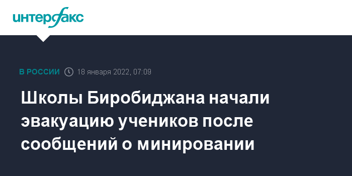 Москва. 18 января. INTERFAX.RU - Сообщения о минировании поступили в образовательные учреждения столицы Еврейской автономной области Биробиджана, учеников эвакуируют, сообщает пресс-служба городской администрации на своей странице в социальной сети.