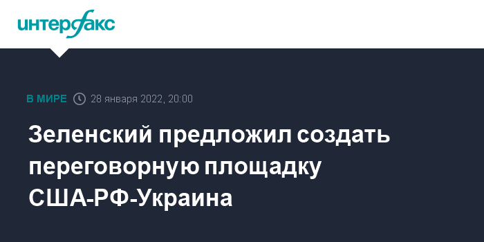 Москва. 28 января. INTERFAX.RU - Президент Украины Владимир Зеленский заявил, что хотел бы создания переговорной площадки по урегулированию ситуации на востоке страны в формате США-Россия-Украина.